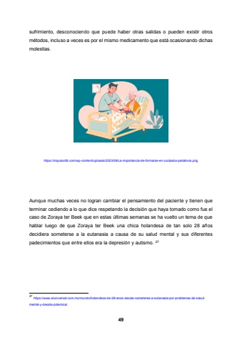 49sufrimiento, desconociendo que puede haber otras salidas o pueden existir otros m%u00e9todos, incluso a veces es por el mismo medicamento que est%u00e1 ocasionando dichas molestias.https://impulso06.com/wp-content/uploads/2023/09/La-importancia-de-formarse-en-cuidados-paliativos.pngAunque muchas veces no logran cambiar el pensamiento del paciente y tienen que terminar cediendo a lo que dice respetando la decisi%u00f3n que haya tomado como fue el caso de Zoraya ter Beek que en estas %u00faltimas semanas se ha vuelto un tema de que hablar luego de que Zoraya ter Beek una chica holandesa de tan solo 28 a%u00f1os decidiera someterse a la eutanasia a causa de su salud mental y sus diferentes padecimientos que entre ellos era la depresi%u00f3n y autismo. 2727 https://www.eluniversal.com.mx/mundo/holandesa-de-28-anos-decide-someterse-a-eutanasia-por-problemas-de-saludmental-y-desata-polemica/